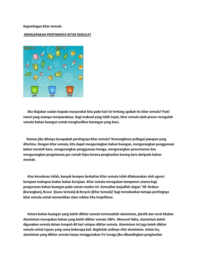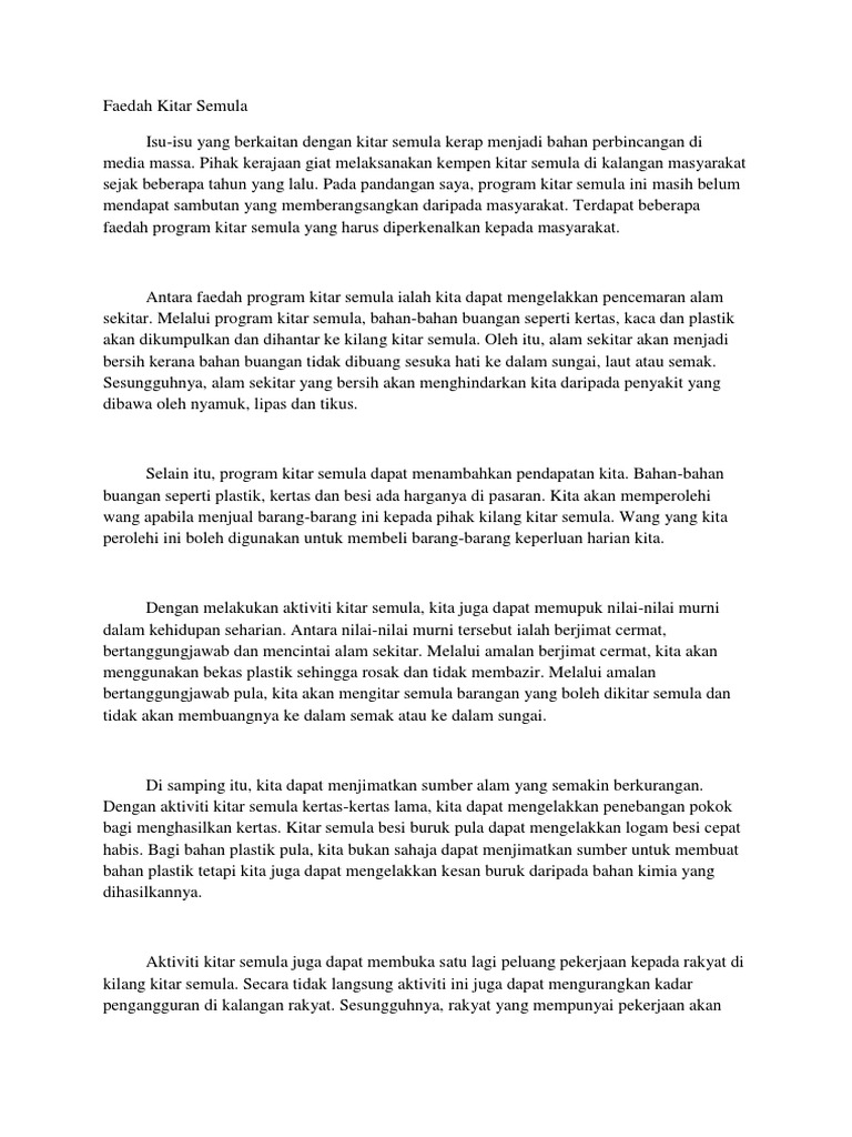 Kepentingan Kitar Semula Terhadap Alam Sekitar Terhadap Masyarakat Membantu mengurangkan pencemaran daripada sisa pepejal. Karangan kepentingan kitar semula pt3 spm isu isu yang berkaitan dengan kitar semula kerap menjadi bahan perbincangan dimedia massa. Alam sekitar merupakan satu anugerah yang tidak ternilai dan tiada galang gantinya.